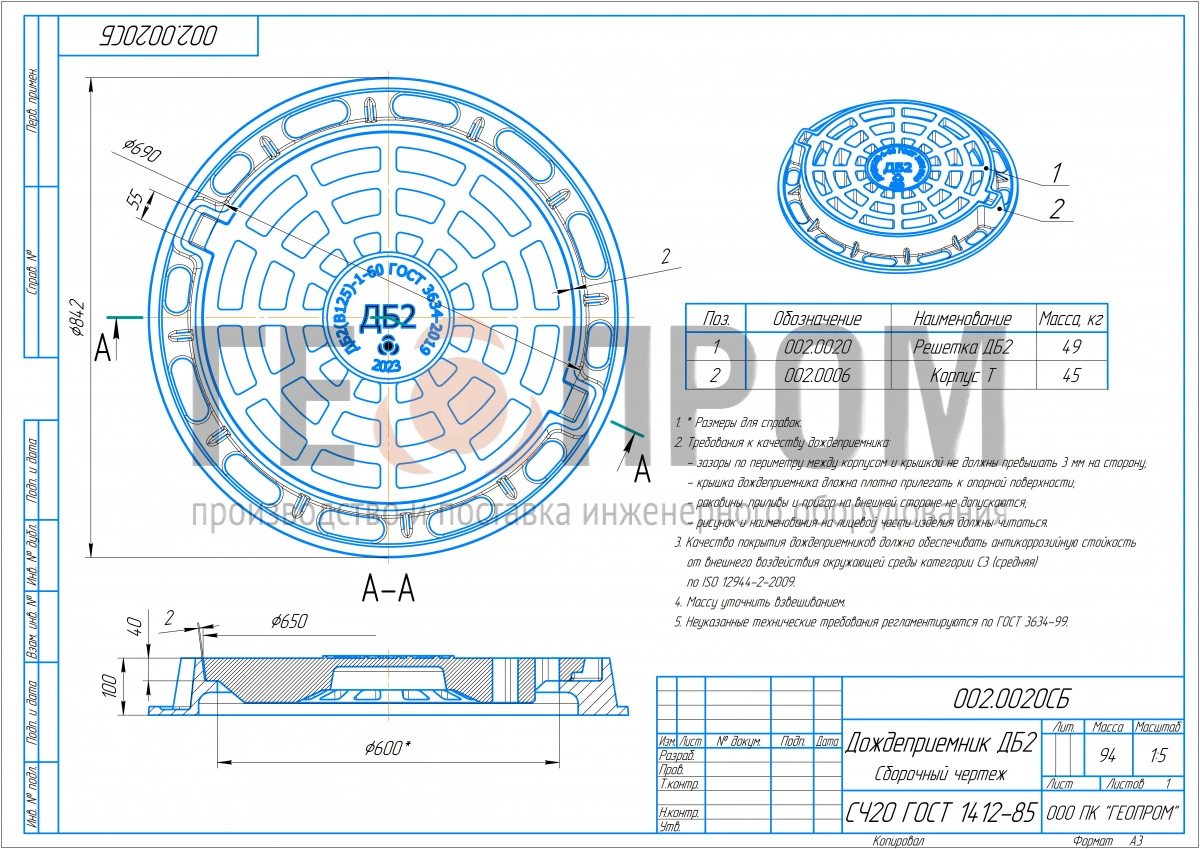 Дождеприемник чугунный круглый тип ДБ2 (В125)-1-60 (ДК)